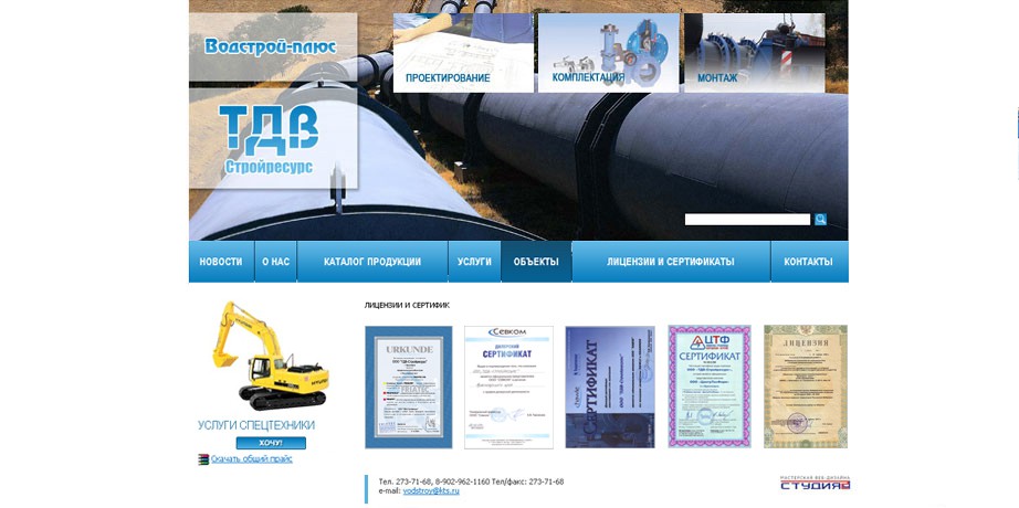Компания ООО «ТДВ-Стройресурс» как дочерняя организация Водстрой-плюс «родилась» в сентябре 2007 года. И специализируется на поставках современных материалов и оборудования для строительства инженерных коммуникаций водопровода, канализации и отопления от ведущих производителей - Erhard, Hawle, Krammer, Hogfors, Raphael, Naval, Vexve, Friatec, Agru, Sauron, Omisa. Фирма предлагает полиэтиленовые трубы, фитинги, сварочное оборудование для сварки ПЭ труб, запорную арматуру, соеденительную арматуру, компенсаторы, насосные станции, котельное оборудование и очистные сооружения.